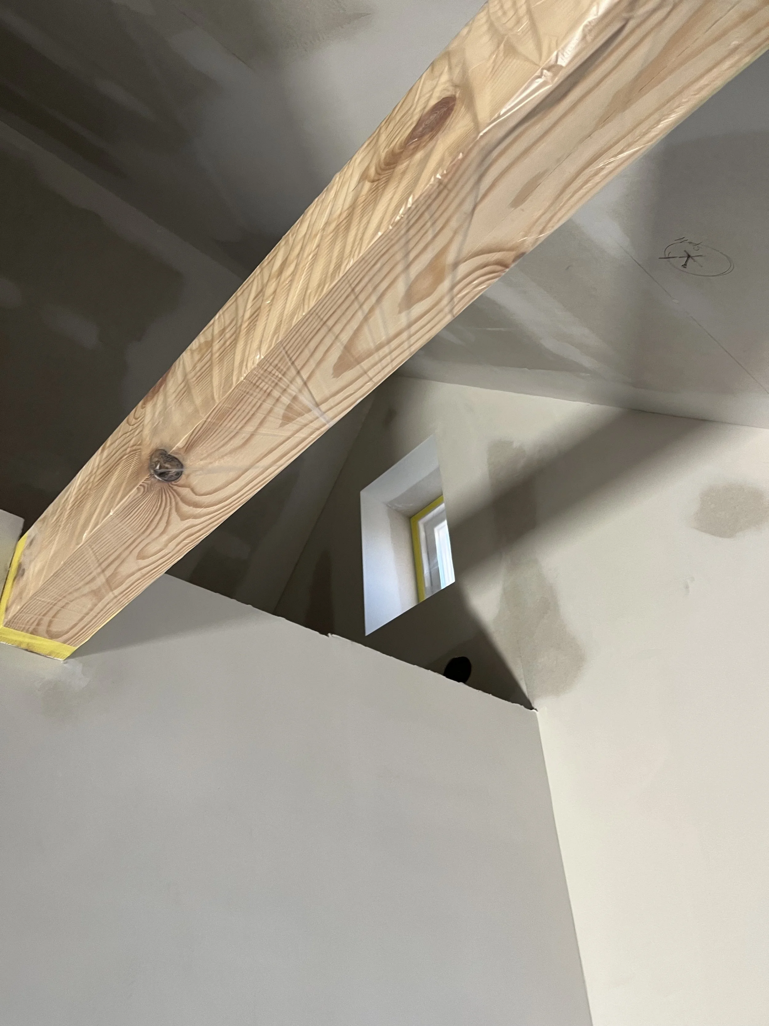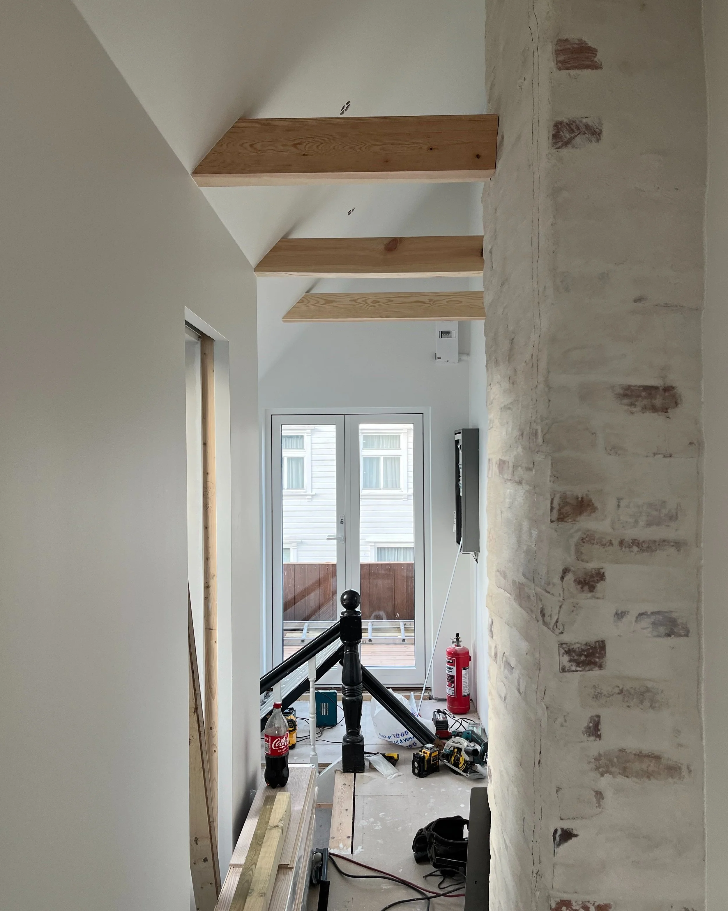 I boligens 2. etasje har vi åpnet opp til møne for å få ekstra romfølelse i boligens soverom. Plassen er optimalisert og innebygde skap gir god oppbevaring på rommene. Materialpaletten består blant annet av sekkeskurt tegl på den gamle pipen, douglasgran på gulvet og lamper i bruneret messing.