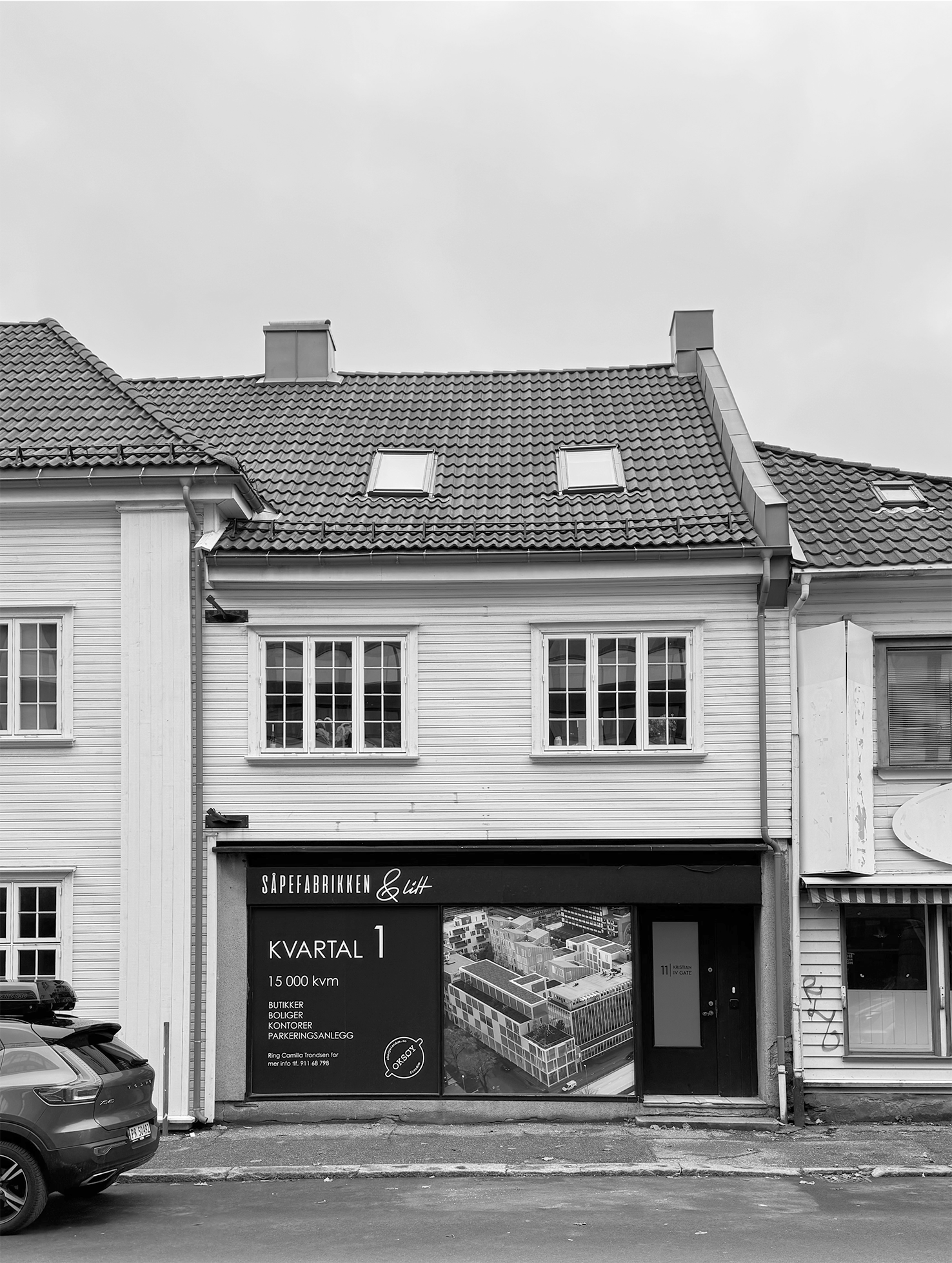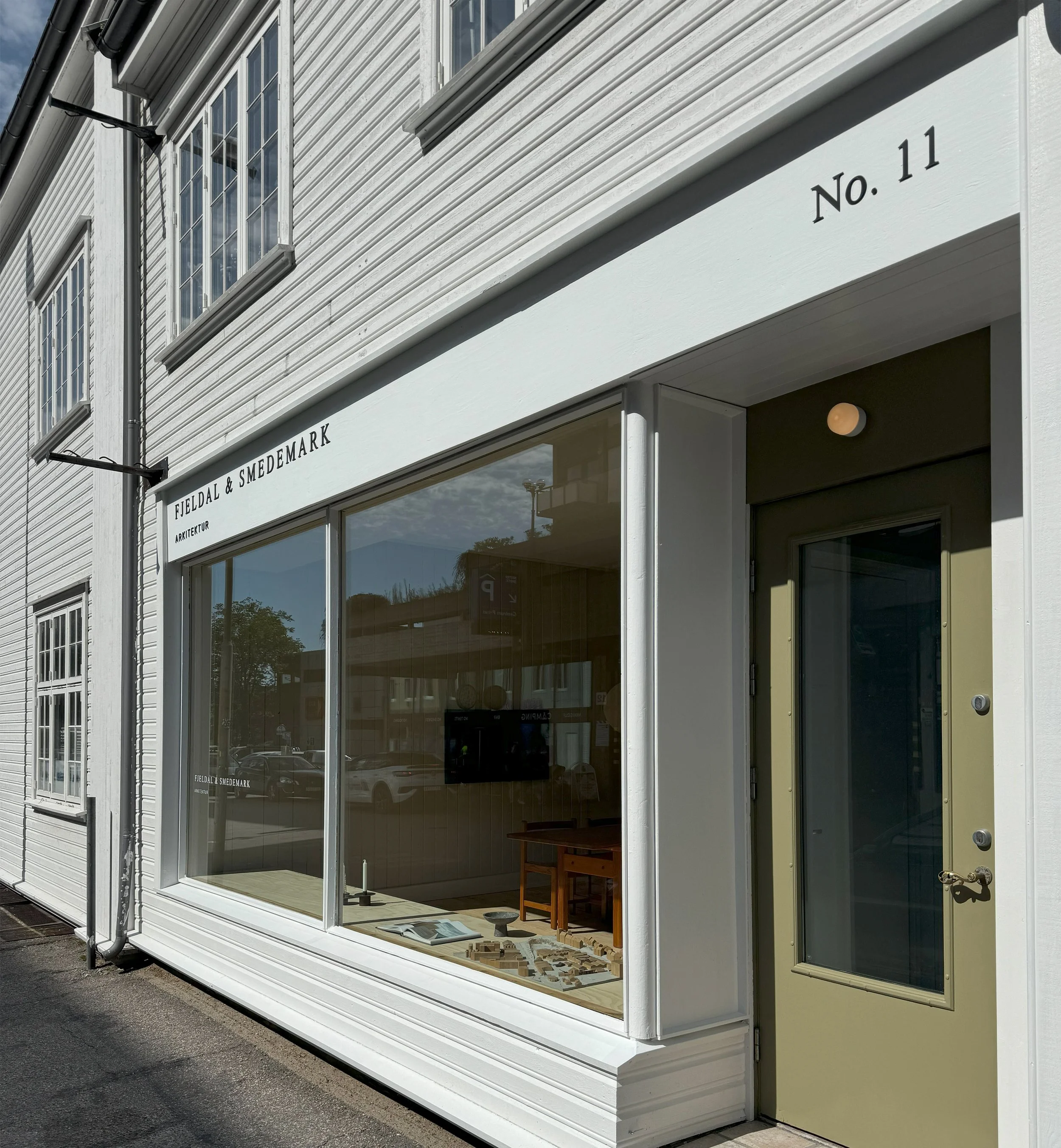 Tegnestuen ligger i et gammelt butikklokale nedenfor gågaten i Kristiansand. Lokalet hadde stått tomt i en årrekke og vi hadde lyst å kunne utstille vårt arbeid i vinduet og dermed bidra til liv i gatebildet.