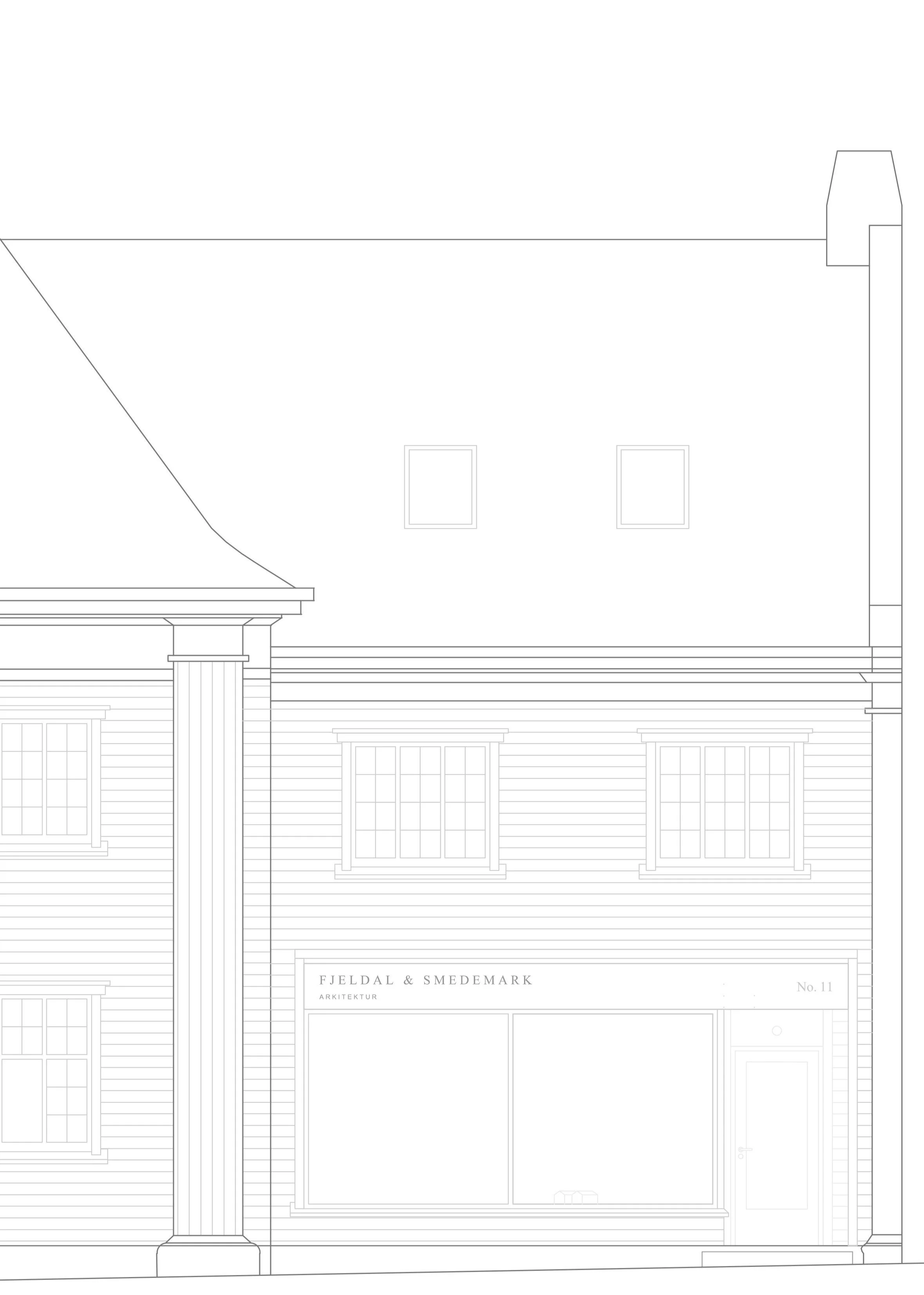 Fasaden på butikken hadde med tiden fått fremmede materialer, preget av store sorte beslag på det ellers klassiske og hvitmalte trehuset fra 1800-tallet. I renoveringen ble de gamle vinduene gjenbrukt og hevet 40 cm for å få finere proporsjoner i fasaden og gi plass til en utstillingsbenk inne i lokalet. Rundt vinduet bygde vi en ny omramning med tredetaljer og kledning som gjenetablerte helheten til det gamle bygget.