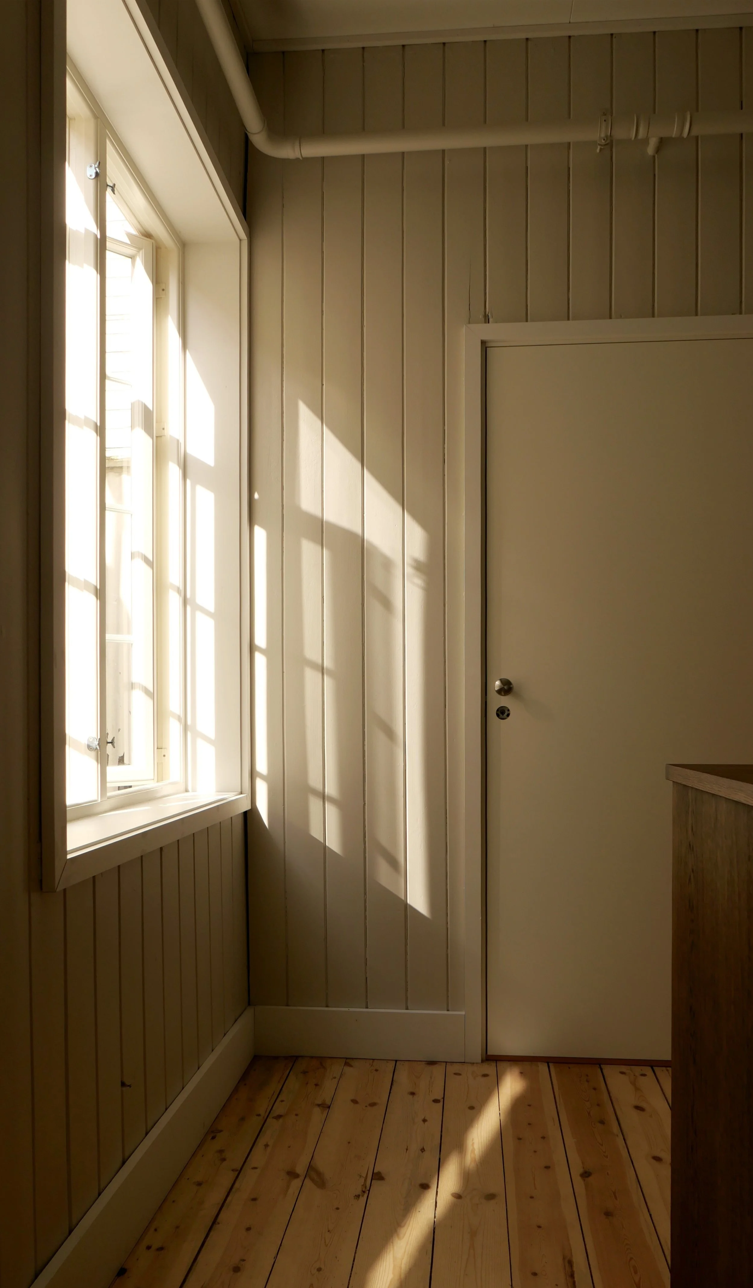 Innvendig fjernet vi lag på lag med dårlige materialer, fram til vi fant et lag av god kvalitet. På gulvet kom det opprinnelige heltre furugulvet til syne, mens veggene hadde et bortgjemt, 100 år gammelt, trepanel. Intensjonen var å skape et stemningsfylt og hyggelig lokale som tok vare på historien, med patina og gode materialer. De nye elementene som er tilført – som kjøkkenet, møtebordet mv. – er i gode og naturlige materialer som speiler kvaliteten til de originale elementene. Kjøkkenet FS01 er plassert i midten av lokalet som en kjøpmannsdisk med kjøkken på den ene siden og bokreol på den andre.